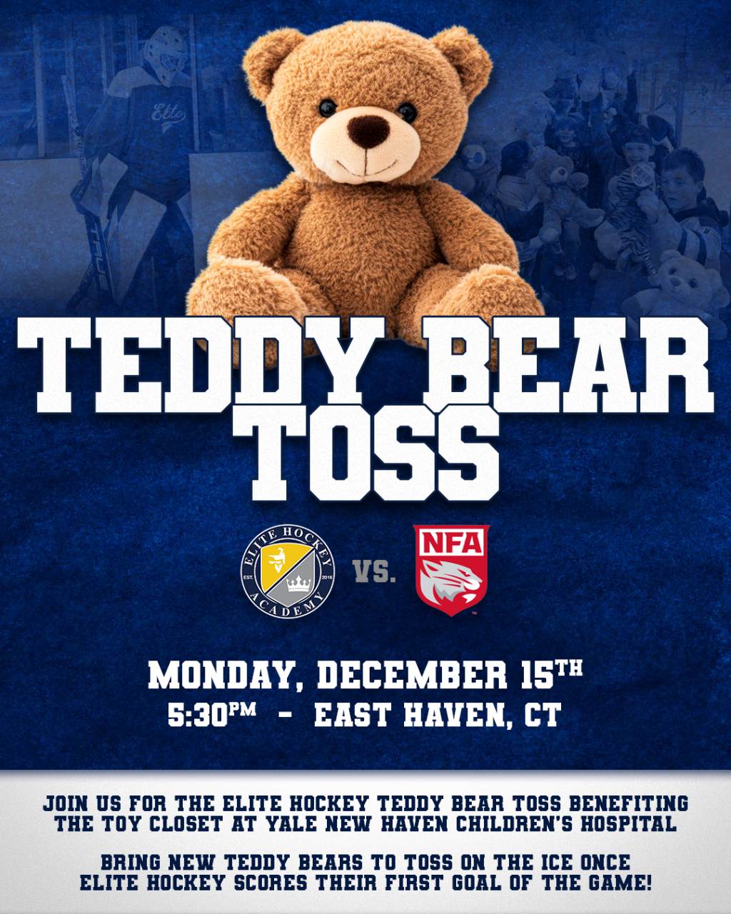 Fans are encouraged to bring new stuffed animals to the game, and when EHA scores their first goal, the crowd will toss the teddy bears onto the ice in a flurry of holiday cheer! Every stuffed animal collected will be donated to Yale Children’s Hospital, bringing comfort and smiles to kids spending the holidays in the hospital.