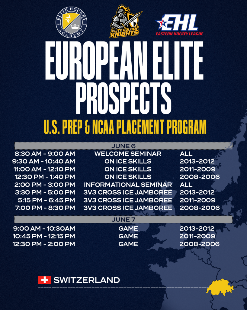 The European Elite College Combine is Europe’s premier event for young hockey players aiming to compete at the next level. Taking place June 6-7 in Porrentruy, Switzerland, this two-day combine offers a unique opportunity to be seen by American college and prep school coaches while developing your skills in a high-level environment.
