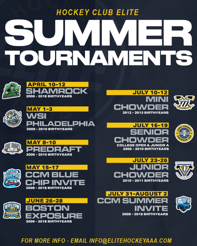 From spring through late summer, Hockey Club Elite is competing at some of the top events in North America. Our lineup is built to challenge motivated players, maximize development, and provide meaningful exposure for every age group.
